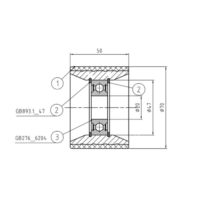 Le noyau de la roue à noyau en aluminium est en alliage d'aluminium. L'alliage d'aluminium a une résistance élevée, une bonne résistance à la corrosion et un poids léger, ce qui permet au rouleau de maintenir un poids global léger tout en supportant de lourdes charges, réduisant ainsi la charge sur le système d'escalier mécanique. ; Le diamètre extérieur est de 70 mm, la hauteur est de 50 mm et il est équipé de roulements à billes à gorge profonde 6204 ; le rouleau adopte une conception structurelle raisonnable pour assurer un fonctionnement stable dans le système d'escalier mécanique tout en réduisant les vibrations et le bruit.